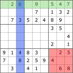 Целта е да бъдат попълнени числата от 1 до 9, като не трябва да се повтарят на всеки ред (зелен), всяка колона (син) и във всеки от деветте еднакви квадрата (червен).
